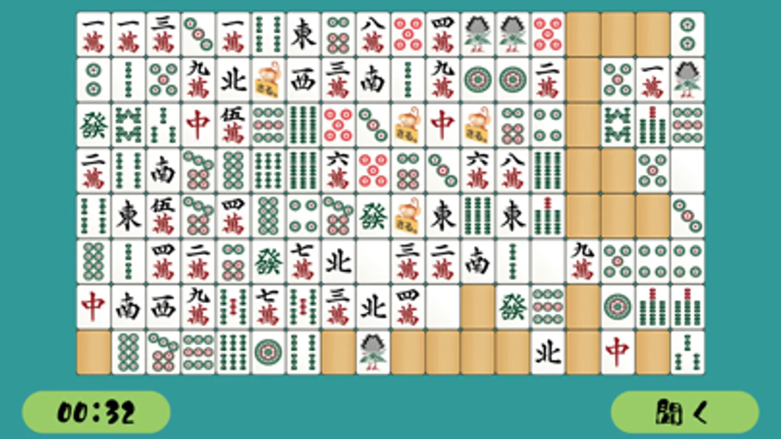 同じ絵柄の麻雀牌を2つずつ消していき、全ての牌を消すパズルゲーム(四川省、2角取り)
