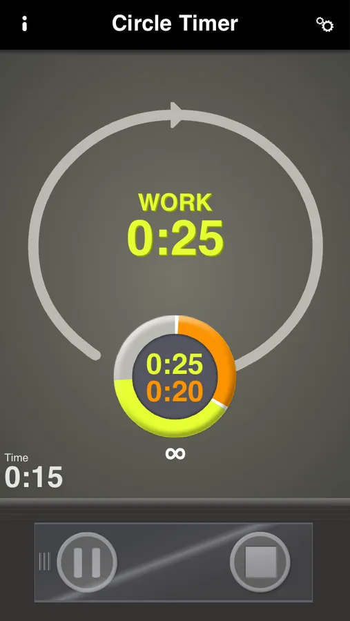 Specify the length of the first interval (Work) and the length of the second interval (Pause). Press Play.