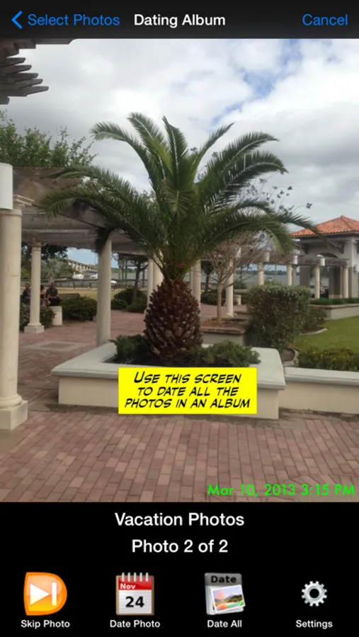 - Step through an album one photo at a time, or tap the Date All button to date all the remaining photos in an album automatically.