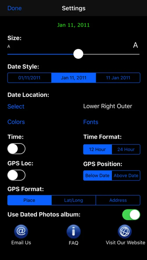 - The GPS location or two lines of text can be included with the date (Note: This feature is only available when dating individual photos).