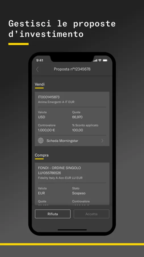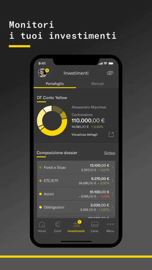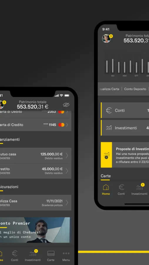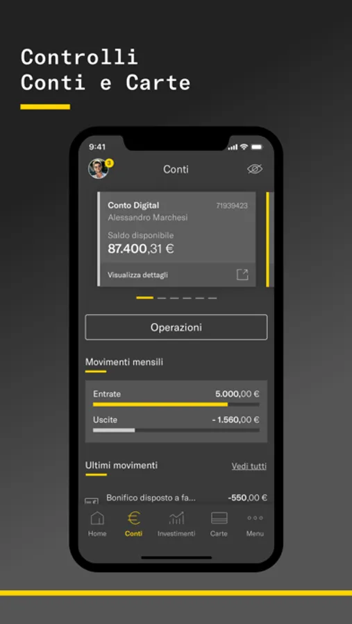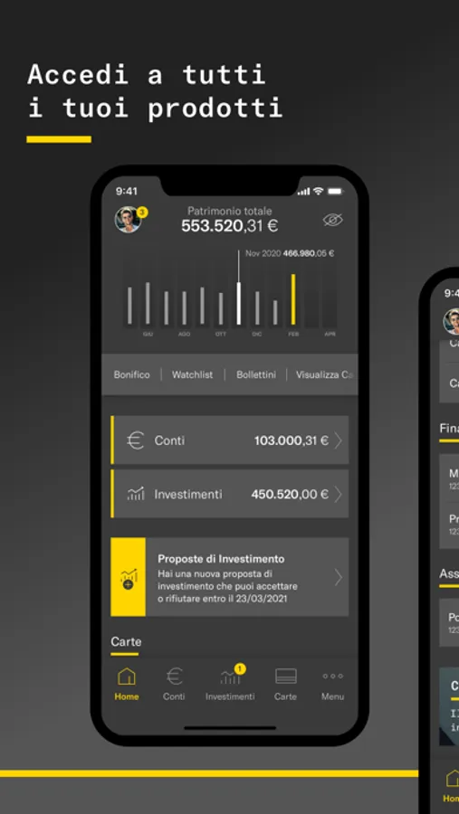 Vedi subito il valore totale del tuo patrimonio, il suo andamento nel tempo e accedi rapidamente ai tuoi prodotti. Bonifici, pagamenti, ricariche, giroconti, nuovi vincoli: puoi accedere alle principali operazioni direttamente dalla Home.