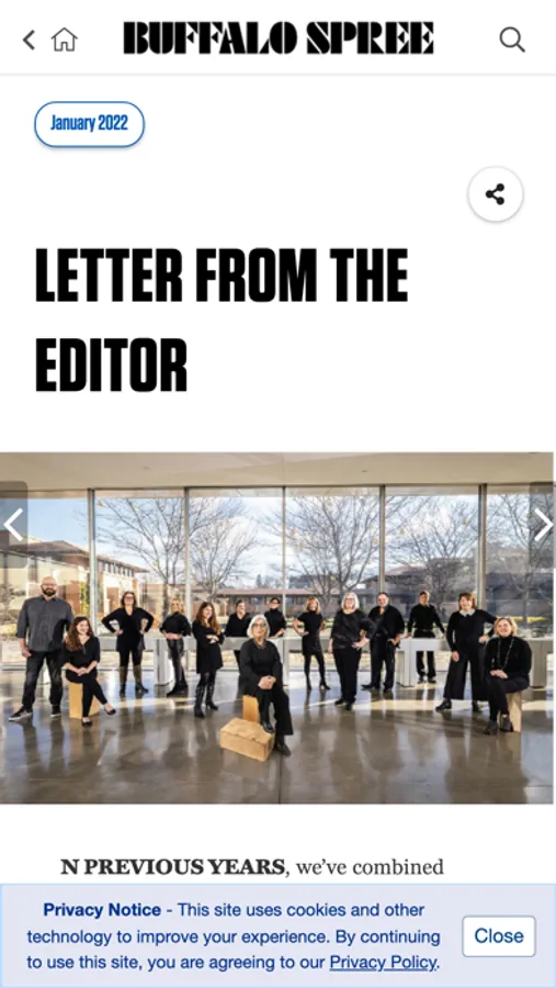 Buffalo Spree, Western New York's city/regional magazine offers entertaining and informative features on WNY arts, food, fashion, recreation, family life, home design, architecture, personalities, and much more. There is a complete events calendar and dining guide as well as theater previews, restaurant reviews, and in-depth reporting on issues important to Western New Yorkers. Read Buffalo Spree to take advantage of everything our region has to offer.