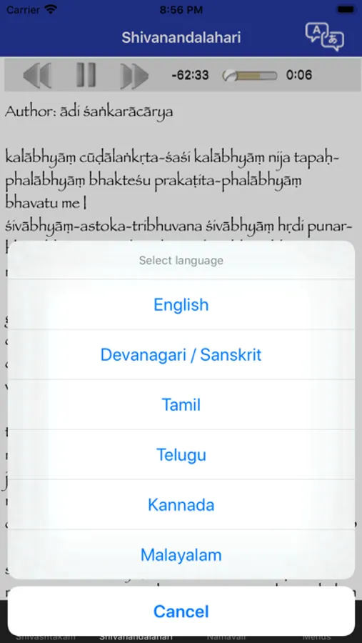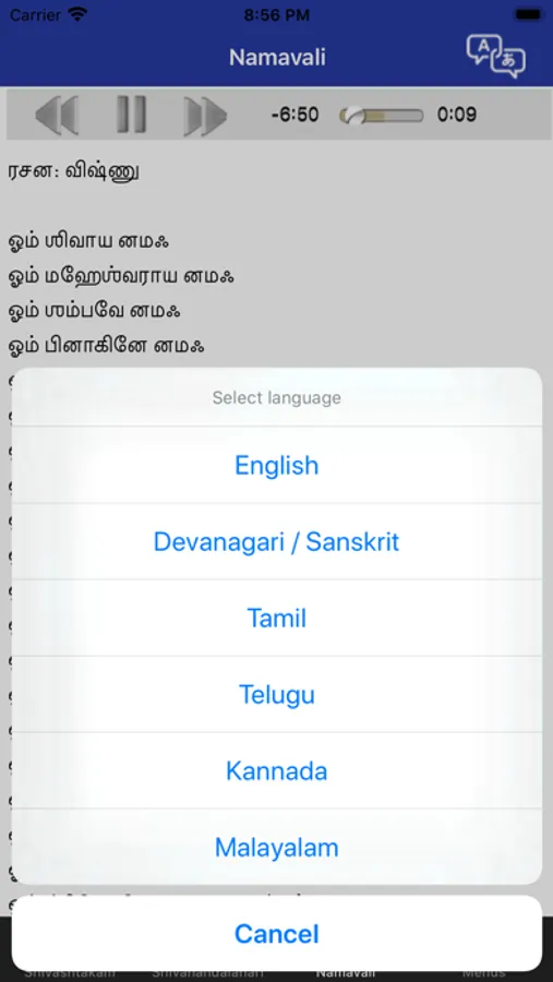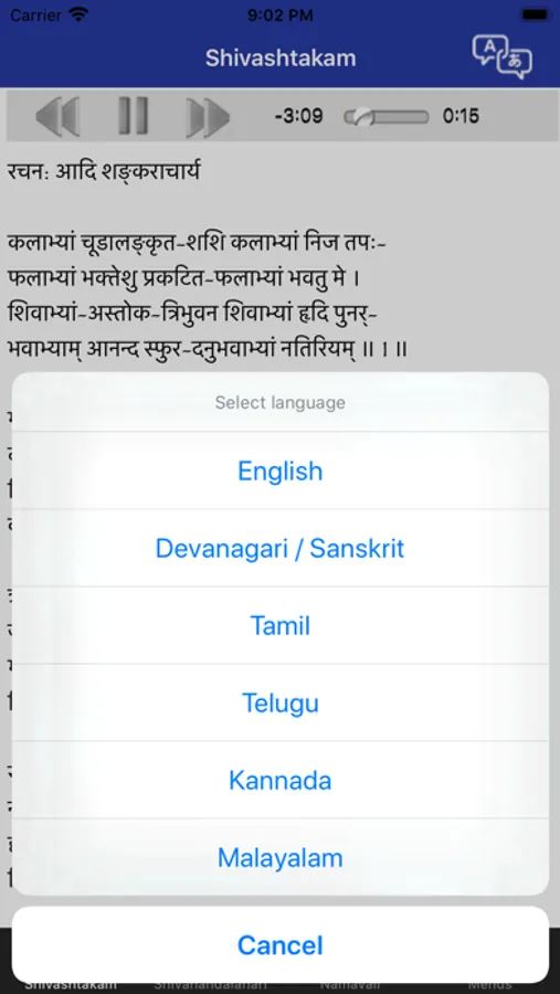 * Lyrics available in English,Thamil ,Sanskrit,Telugu,kannada & Malayalam (User can select different languages for lyrics using Language icon in the top Right corner) .