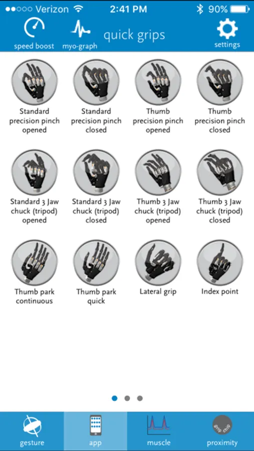 • Instantly access 24 quick grips and 12 fully customizable my grips™ (available with i-limb quantum and i-limb revolution, 14 quick grips with i-limb ultra and i-limb digits, 12 quick grips with i-limb access and i-limb select) providing effortless control of the prosthesis with a single tap of your mobile device