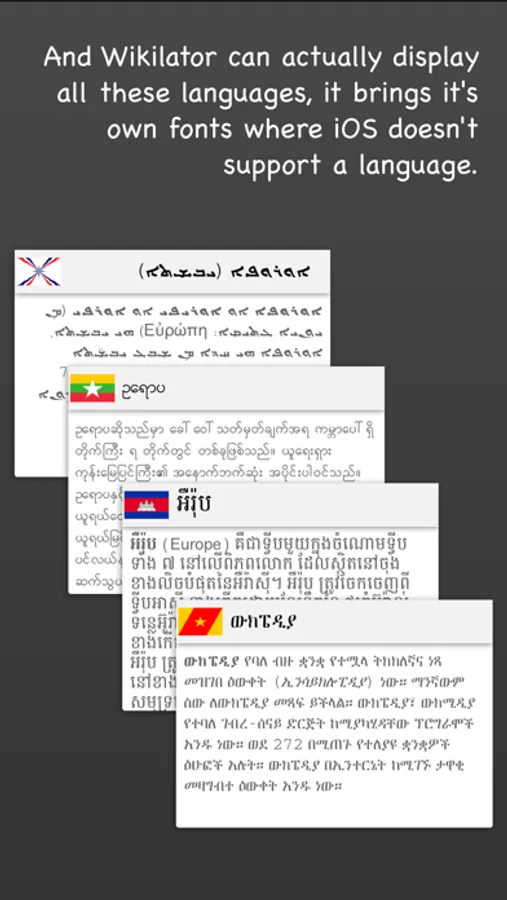 Even for writing systems like Khmer, Burmese, Amharic or Aramaic which are not natively supported by iOS, Wikilator brings its own fonts, so you can really view these pages on your iPhone or iPad.