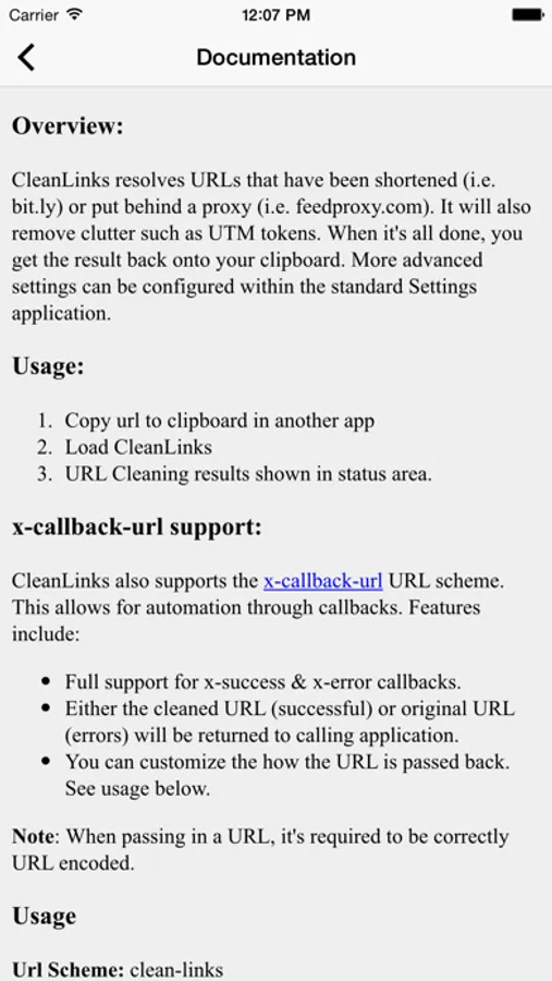 Clean Links also fully supports the X-Callback-URL Scheme. Which means it's compatible with apps such as: