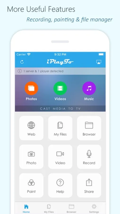 Play photos, videos and music from your iPhone/iPad to DLNA devices such as your Smart TV, AV Device, Sound Box, PC, other phone and pad, etc.