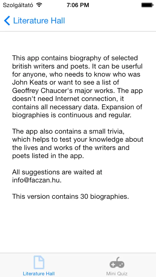 This app contains biography of selected british writers and poets. It can be userful for anyone, who needs to know who was John Keats or want to see a list of Geoffrey Chaucer's major works. The app doesn't need Internet connection, it contains all necessary data. Expansion of biographies is continuous and regular.