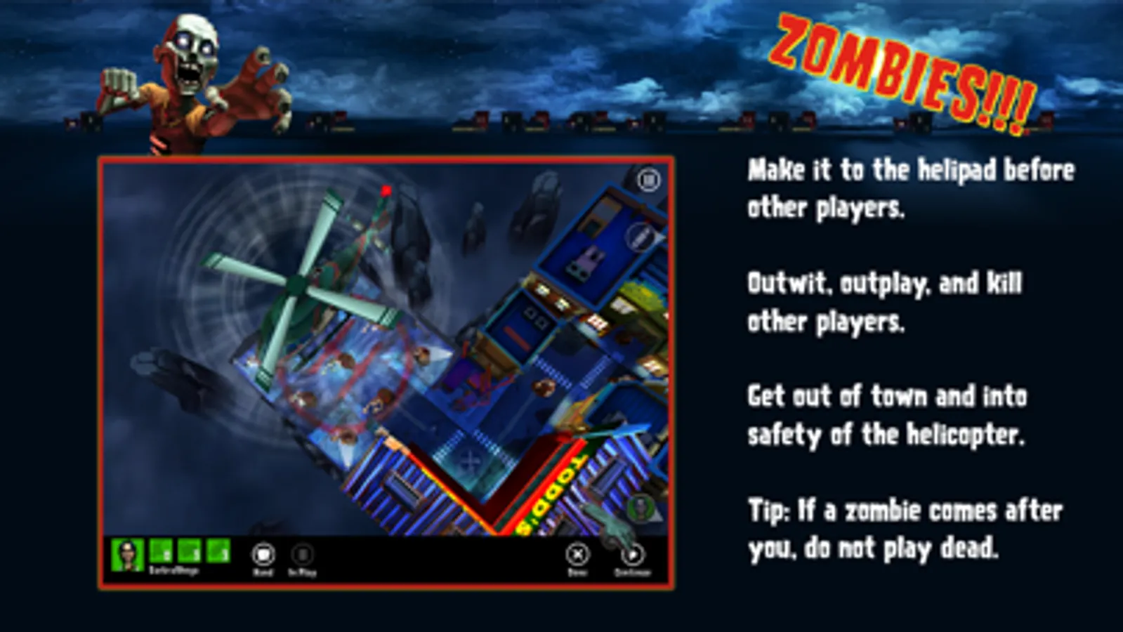 In order to escape the ever advancing zombie horde, players must use a combination of wits and brawn to be the first to the heliport and certain escape. The only problem is, the zombies are everywhere, they appear to be very hungry and your opponents would really prefer if you didn't escape. However, there’s no need to take this horde on your own. The game allows up to 4 other human or AI players to join in on the fun. AI players can be chosen from 10 different characters, each with a unique play style.
