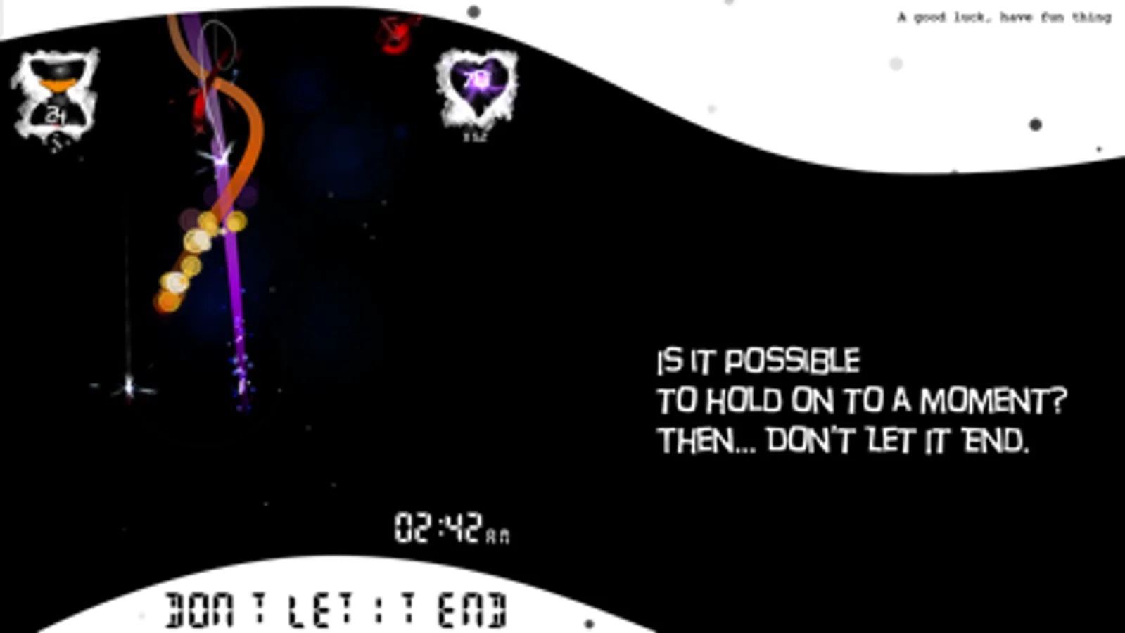 Don:t Let It End is an expression of an impossible sentiment. The idea was sparked in a moment that I never wanted to end. Inevitably, it ended. I thought a lot about that, and in my mind I imagined the flow of time as it is realized in this game.
