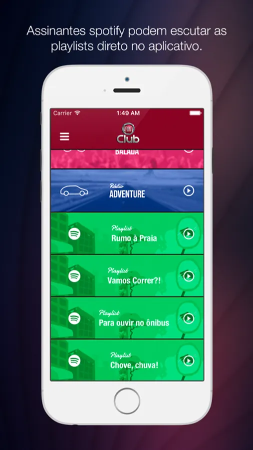 - Spotify: Aproveite das playlists da Fiat, com apenas um clique você é direcionado ao aplicativo do Spotify para escutar nossas seleções musicais.