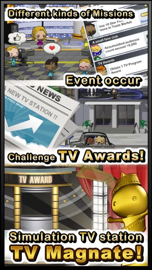Contribute to your city, gaining more rights to expand your television station, building studios, rebuilding yourTV Towerto broaden the coverage, allowing more audience to enjoy your programs!