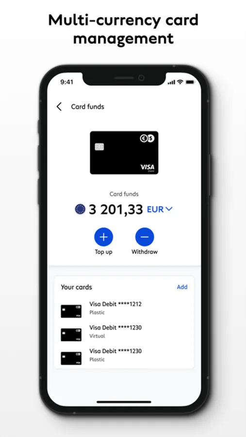 Order a card for payments in 160 currencies and easily manage it in the app. Stay in control of your spending, set limits, link it to Google Pay and withdraw money from ATMs around the world.