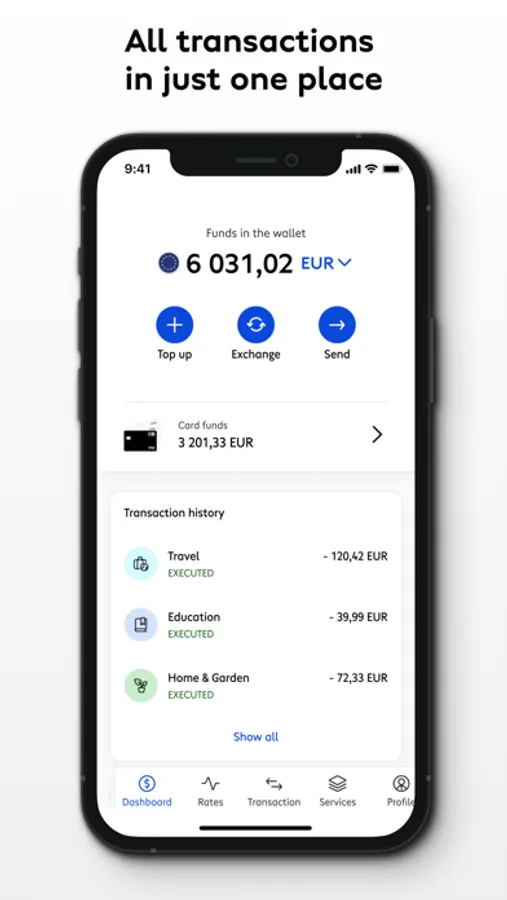 With this app, your finances are always under your full control. Shift funds from your currency wallet to your card and the other way around. Exchange currency and keep money on dozens of currency accounts. Conveniently manage your expenses and meet your goals. Don't worry about additional fees - you always know the final cost of the transaction in advance. No hidden currency exchange costs.