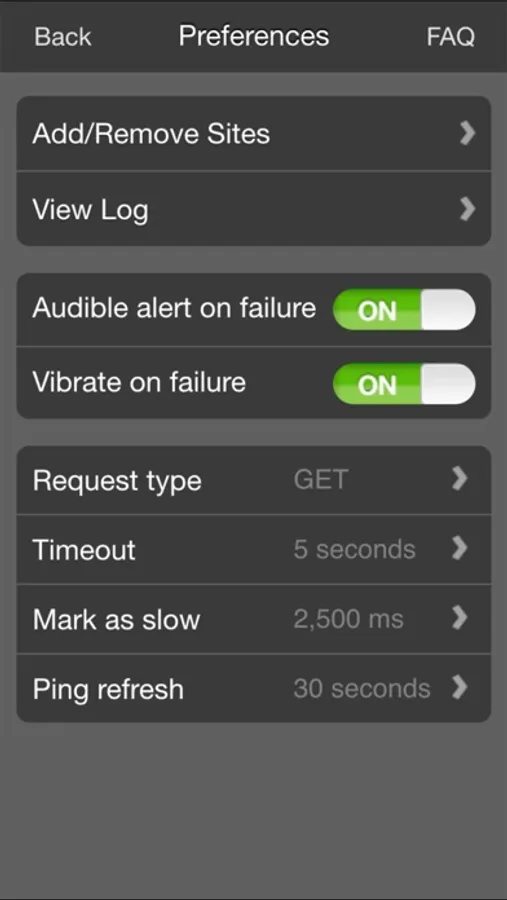 EXAMPLE: The Timeout is set to 5 seconds and your site does not respond within 5 seconds. Based on your settings, an audible alert and/or local notification will be initiated and the monitor's associated indicator will be highlighted as FAILED.