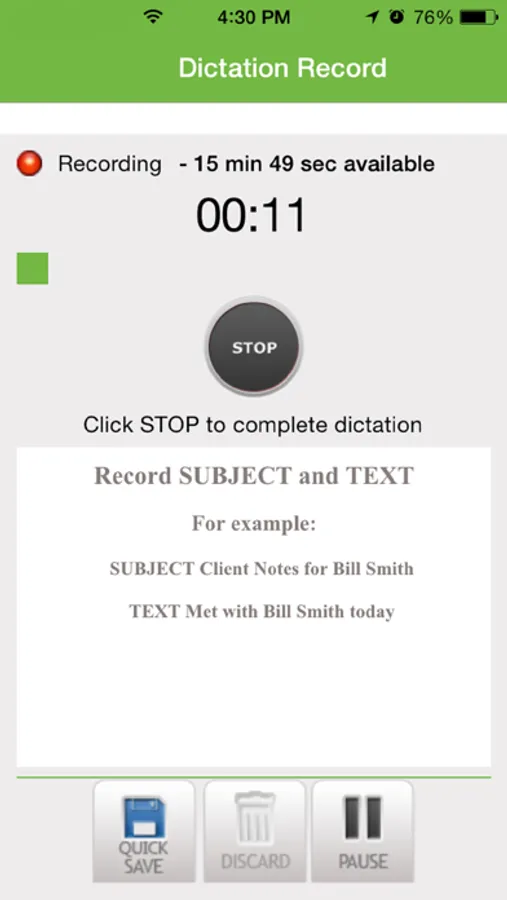 After installing the application, enter your account credentials when prompted. Tap the Record button on the lower right to enter the recording screen. Record your dictation, then review it, save it, or discard it at your discretion. You may give your IOS-recorded dictations any name you like for ease of reference when navigating the application.