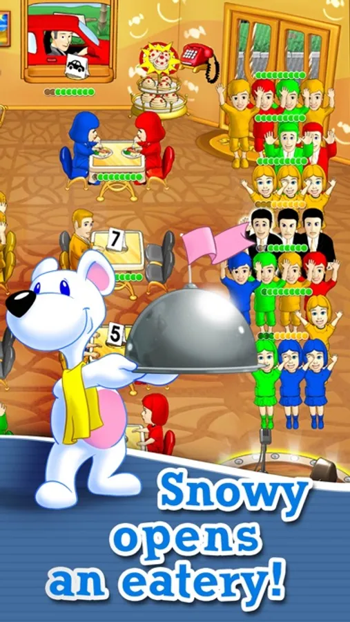 Snowy the Bear opens his own eatery and offers fast-paced yet simple fun. Seat hungry customers, take orders, serve food, collect cash and clear tables. Match colors, chain actions and keep your customers happy to earn big tips! Deal with VIPs and don't miss impatient drivers.