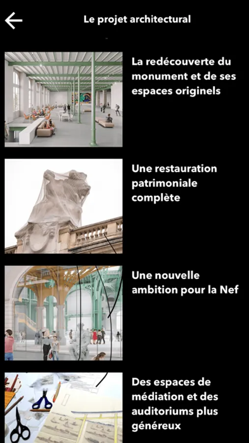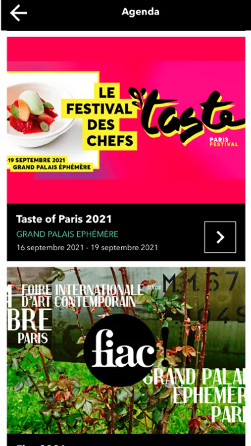 -The application also features listings for the cultural programme in the auditorium (conferences, concerts, films, etc) and the different spaces of the Grand Palais, around the exhibitions (live performances, events, etc)..