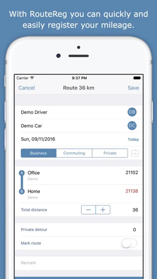 RouteRegistration is the ideal app for tracking mileage for reimbursement or tax deduction. By using Hotspot Detection you are notified when you have arrived at a destination. By using a supported Bluetooth Smart tag, RouteRegistration Car Detection will detect your car automatically and will notify when you leave your car. So you'll never forget to register your mileage! Because RouteRegistration calculates the mileage from previously registered routes or the ideal calculated route, registering your mileage is super easy. Combining Hotspot Detection, Car Detection and automatically calculation of the mileage, it's possible to register a ride with one touch, just press 'Save'!