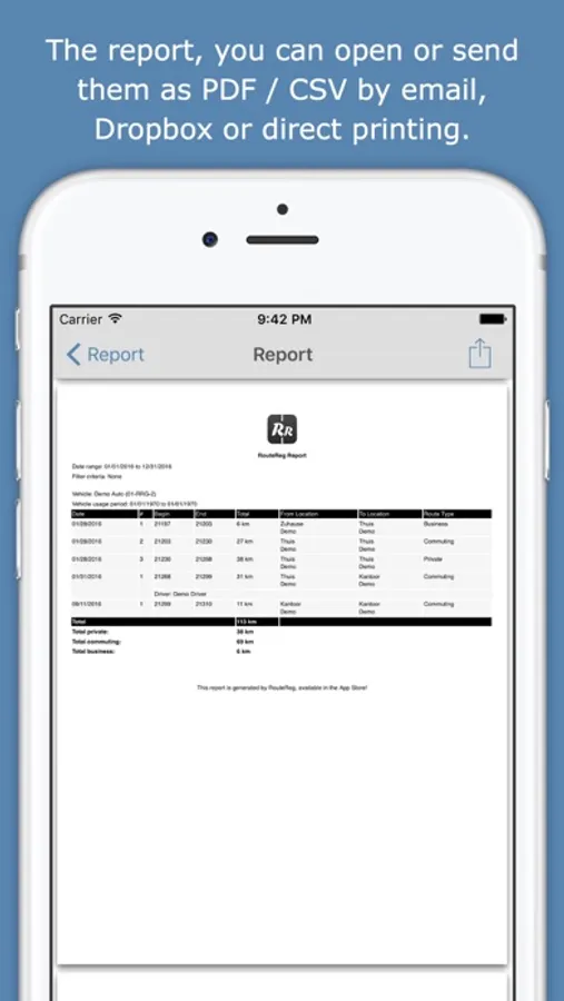 RouteRegistration can easily generate a report containing all important information about your mileage registration. This report allows you to filter by date and search criteria. You can choose from various export possibilities; Send by e-mail, export to Dropbox or print to an AirPrint-enabled printer. In both email and Dropbox exports an PDF and an CSV file are included that you can use in Excel. Also all export files are stored on the iOS device itself, these files can easily be transfer from iTunes to your computer.