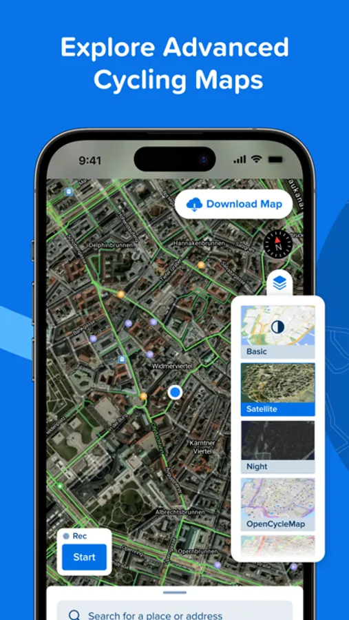 • Advanced Cycling Maps: Access additional map layers developed for cyclists (3D, Night, OpenCycleMap, OpenStreetMap, Satellite, Atlas, Outdoors, Landscape).