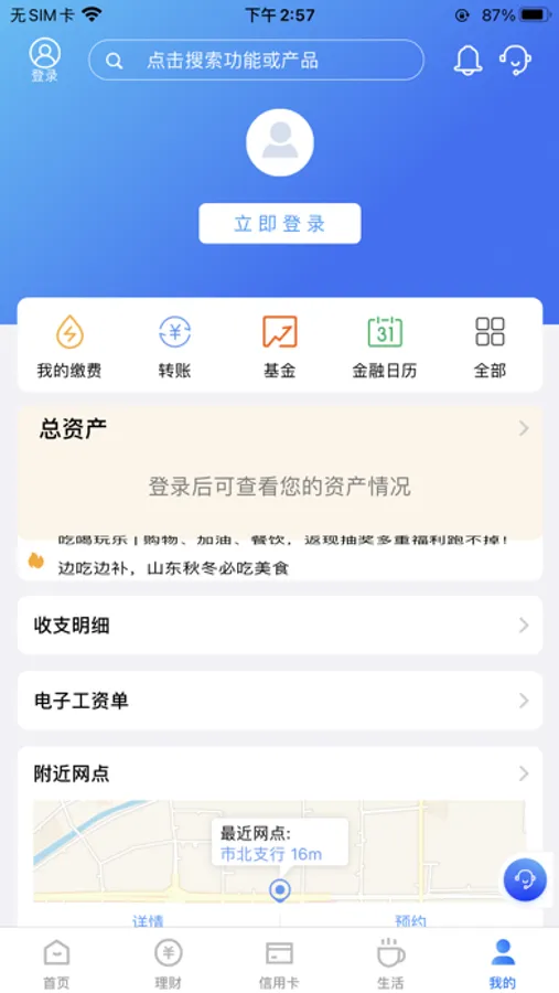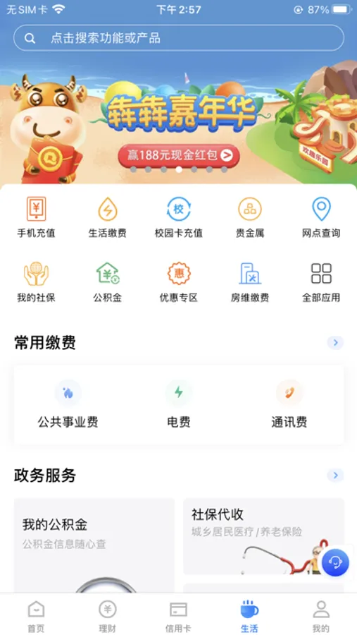 随时随地的生活服务。支持生活缴费、手机充值、周边网点查询等,弹指间丰富您的生活。