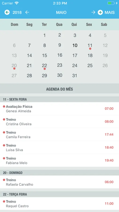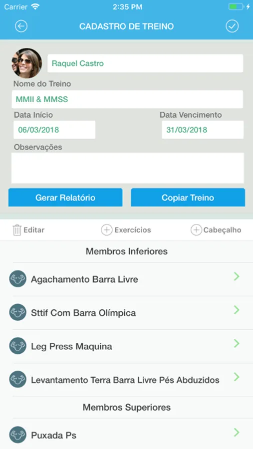 Você pode também cadastrar treinos dos seus alunos.