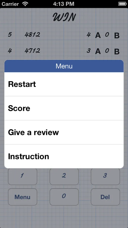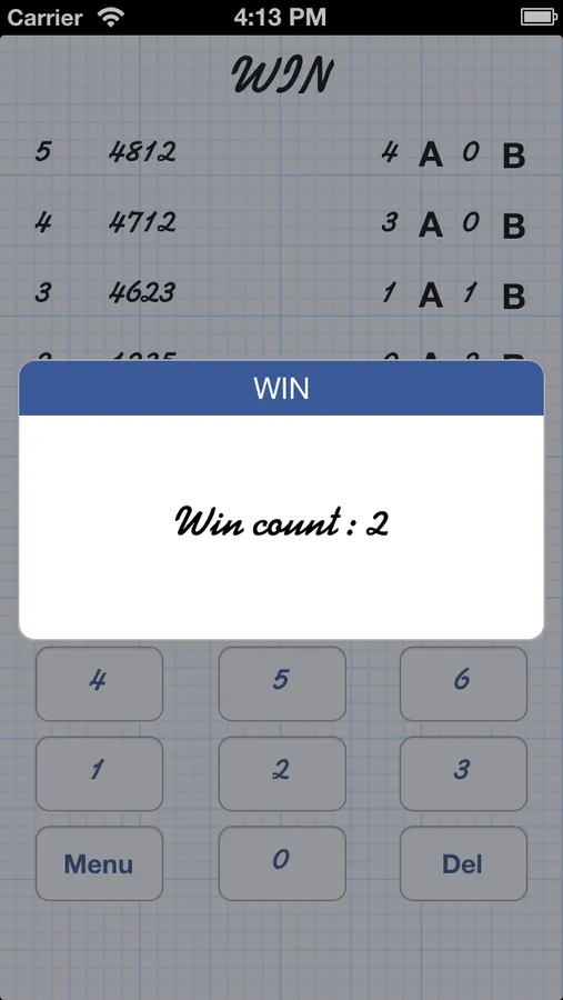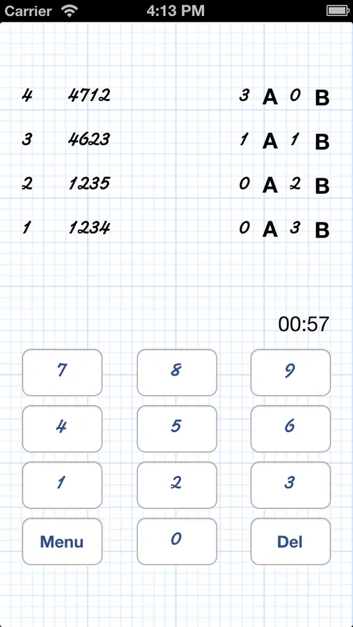 Numbers (Bulls and Cows) is a roughly in the middle of twentieth Century appeared in England puzzle game. Rules of the game is simple, but it tests rigorous and patience. At a game begins, the automatic generation of a four digit number will be generated, and the four digit number is not the same. When you guess a number, will get a (n)A(m)B, including A in front of the number indicates the number of the correct position number, and B before the number indicates the number of correct and incorrect number of locations and the number of. If the correct answer is 5234, and if your input is 5346, is 1A2B, the '5' position is correct, denoted as 1A, while '5234' contains '3' and '4', but the two number are not on the correct position, therefore, denoted as 2B, it's 1A2B. Then according to the records of several A B continue to guess, until the guess (4A0B).