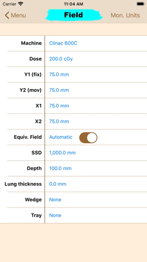 MUVerify can be used for LINAC as well as Cobalt-60 therapy units. All computations are for the central axis. Radiation fields allows the inclusion of wedge and trays. The wedge can be physical or EDW. When using a physical wedge, MUVerify computes a generic beam hardening factor (BHF) based on linear regression of BHF as a function of wedge factor for several depths in water for different beam energies. To compute the wedge factor in case of EDW a method based on Gibbons’ algorithm (Med.Phys.25.1998) was implemented. For the case of shaped fields (with cerrobend blocks or MLC) the user can enter the effective field size. Regarding heterogeneity corrections only the lung is considered; an optional parameter sets the thickness of lung that the beam is crossing.