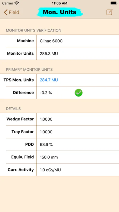 The MUV value resulting from MUVerify is compared with the primary MU from the TPS. For most of the fields the agreement should be better than 2%, but for complex fields using a thick physical wedge or in the presence of lungs the deviation could be greater. The adoption of an action level is left to the user, but a recommendation of 5% is widely accepted.