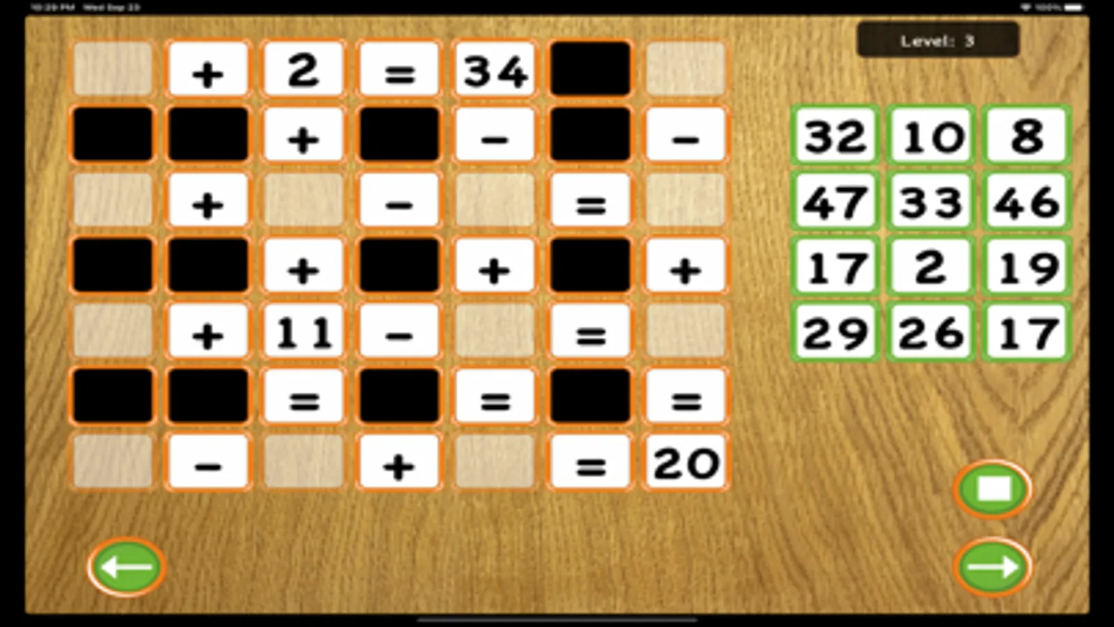In the easy level only the numbers after the = sign have to be filled in. This level is well suited for children.
