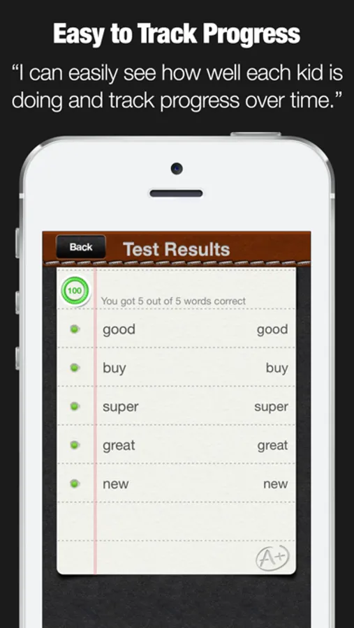 ● Track your kids progress and quickly see how they are doing for each test they took as well as which words if any they are struggling with.