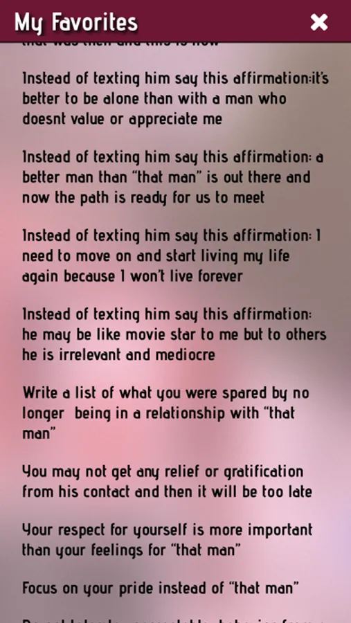 The app contains 100 quotes designed to alert you to the consequences of your contact with an ex-boyfriend or a man you’re trying to let go of. The app will give you psychological perspective on "that man's" possible negative reaction to your contact, advise you on why it's generally counterproductive and self-defeating to contact "that man", quickly boost your self-esteem, and suggest more productive alternative behaviors.