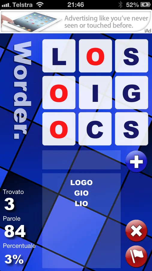 The game Worder involves guessing all the words that can be made from combinations of 9 letters. All the letters also make up one 9 letter word. This version of Worder uses an Italian dictionary. The interface is also in Italian.