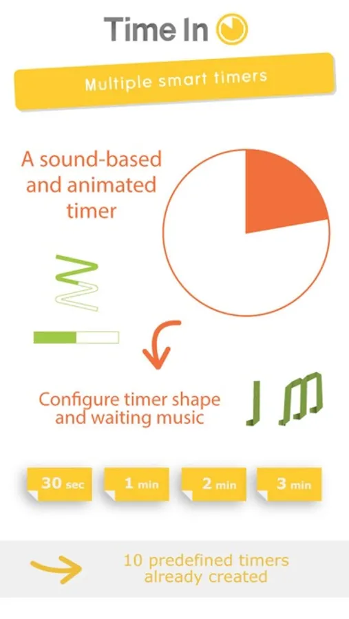 - Start timers very quickly thanks to 10 preset times: the circle fills with a color and shows how much time has passed, and how much time is left.