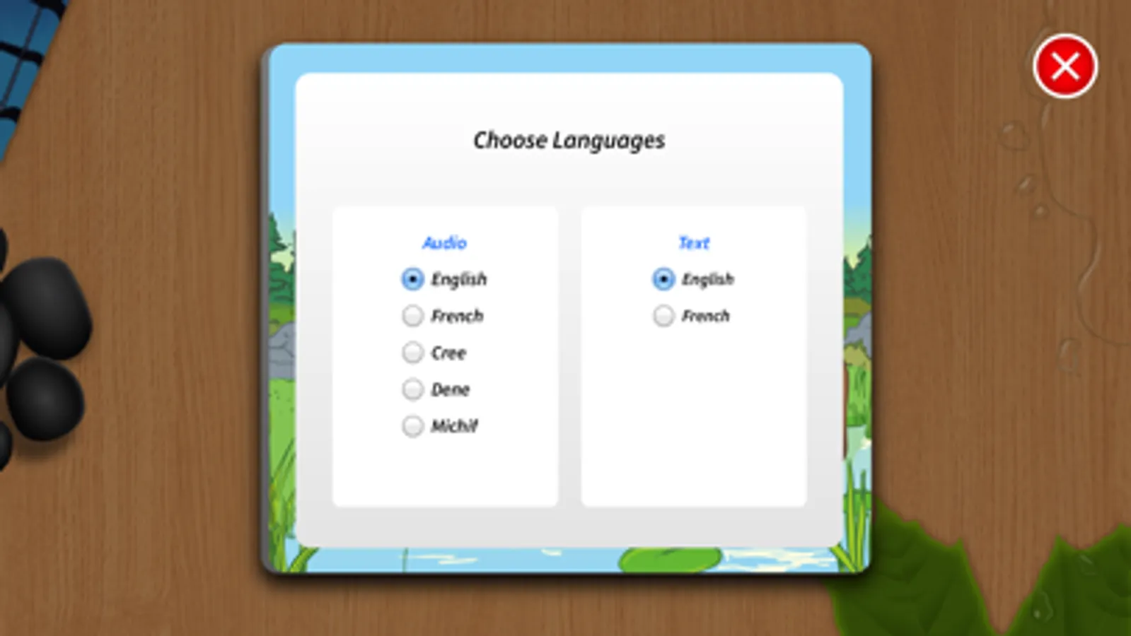 Read along option in five languages: Cree, Dene, Michif, English and French