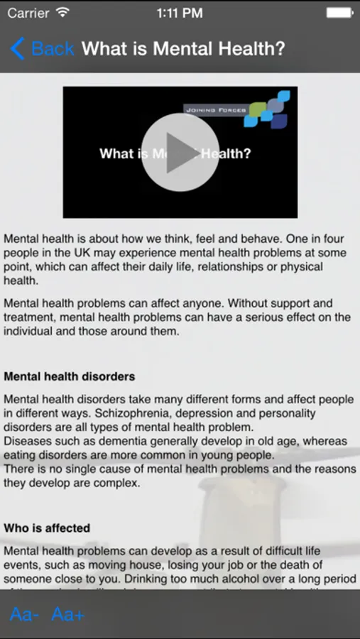 This app delivers information and support surrounding mental health disorders.