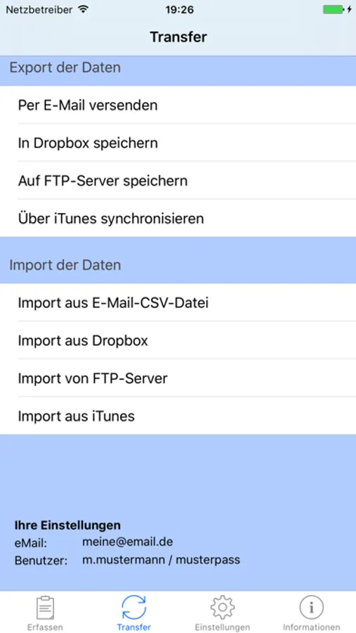 Alternativ können die Daten über eMail oder iTunes synchronisiert werden.
