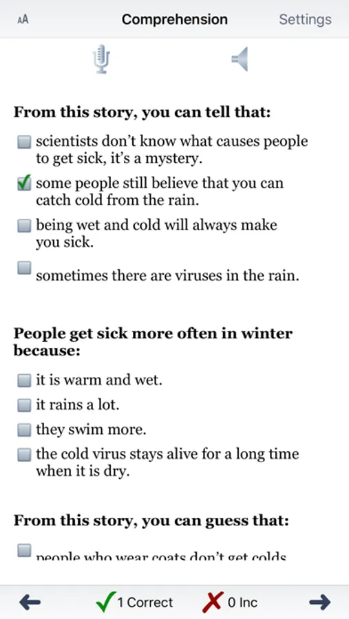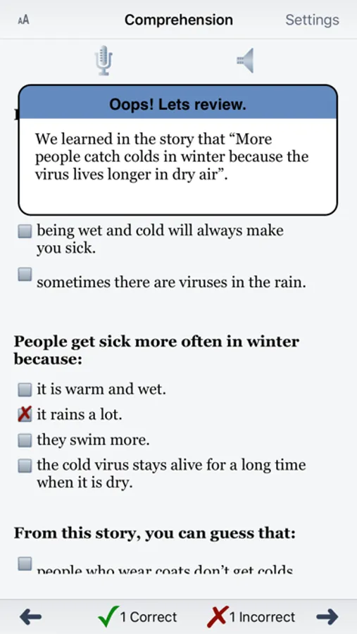 Often the student gets a question wrong because they focus on a detail of the story. Sometimes they recognize words or numbers in the answers and choose an answer because the words are familiar. The popup explains why incorrect answers may appear to be correct. It also explains why the correct answer is, in fact, the right choice. After the student studies the explanation, they should read the question again and answer it using the knowledge gained from the explanation. If they want, the student can swipe back to the story and look for the answer in the story. An option lets the student choose to see the explanations after each answer is selected, rather than just after incorrect answers.
