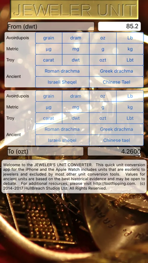 Jewelers often need to convert between units for price calculations and appraisals, but some of the weight/mass units are esoteric to the industry and are not present in many calculation tools.