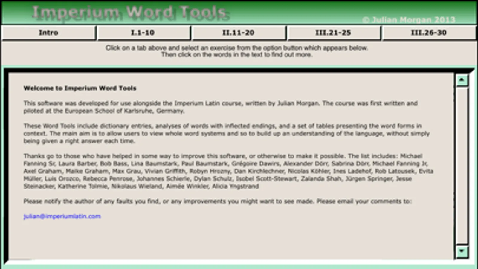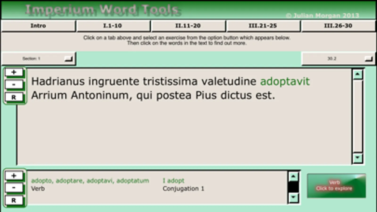 This version of Imperium Word Tools is geared to use with the Imperium Latin course, written by Julian Morgan. It contains all of the Latin into English exercises from the course, including 50 poems by the Roman poet Martial. For details of the Latin course, see: