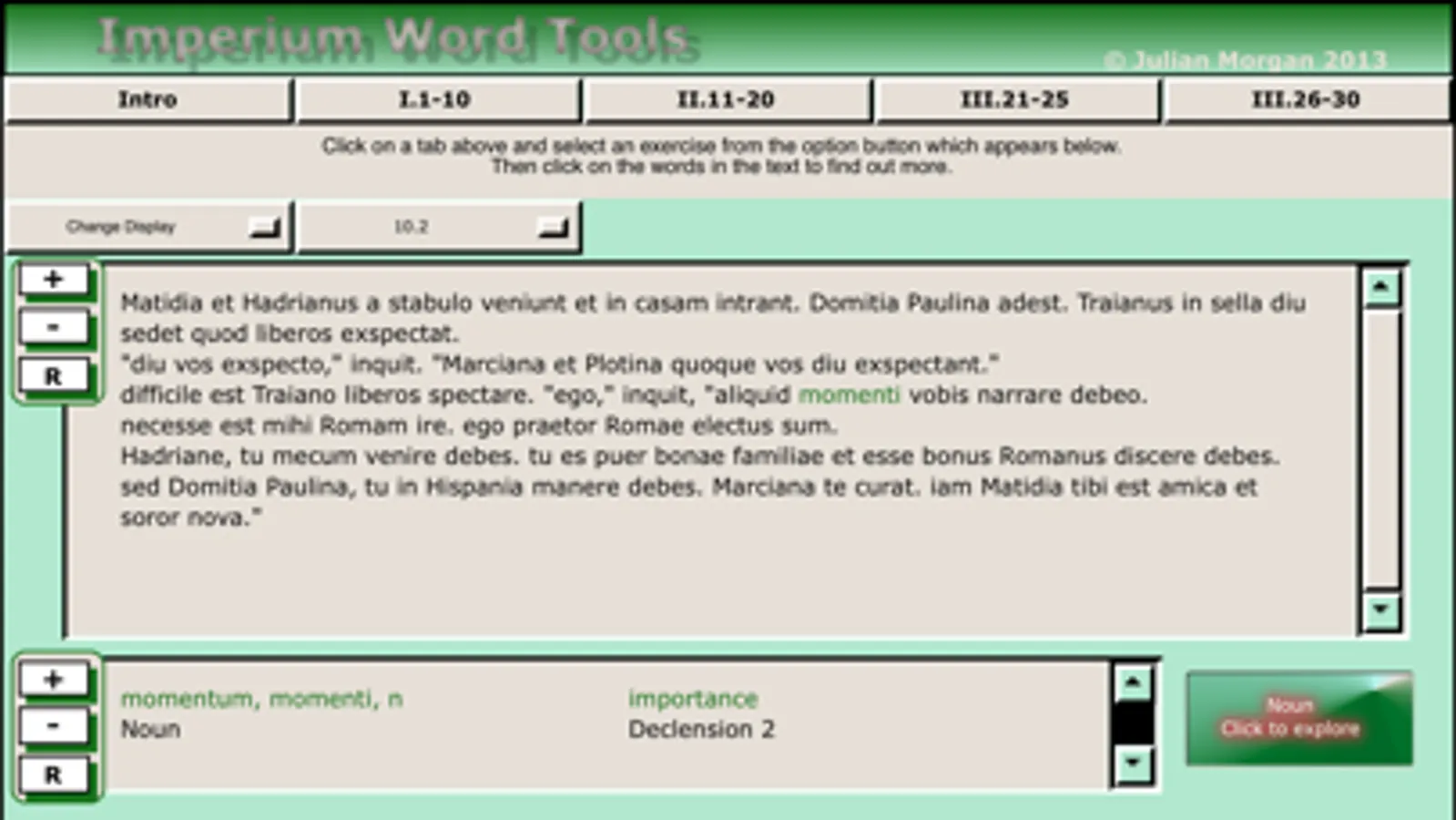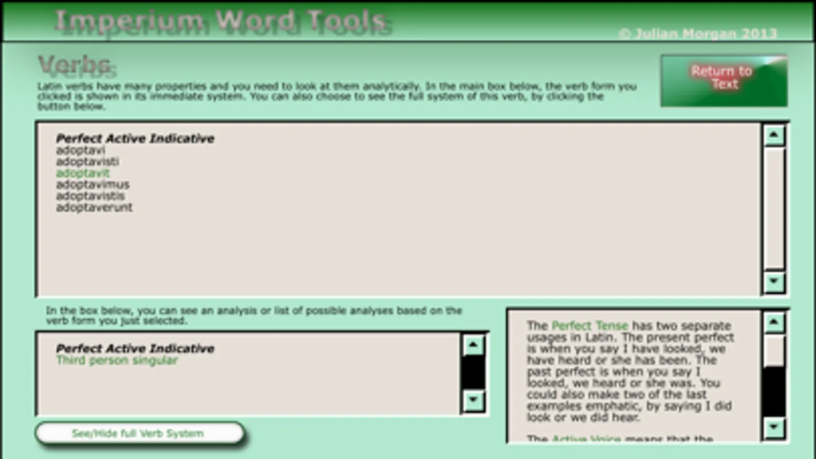 Imperium Word Tools is a highly developed modern system, designed to assist in understanding the Latin language. It offers a dictionary at the front end, which presents words and their dictionary entries in a conventional way. At this point the user can follow through to the second level, where each word is shown within its immediate system. In the case of non-inflected words, this is kept to a minimum, but in the case of nouns, adjectives and verbs, the whole system is shown. So, for example, a noun is shown with endings for all of its six cases, in the singular and plural. The exact form of the word as it appeared in the text is highlit in green, but this appears in each part of the table where it may be repeated, so the user can see all of the possible correct analyses for it. In the case of the word 'servi', for example, the word would appear in green three times, in the genitive singular, the nominative plural and the vocative plural. A set of texts is also presented, which explains the terms used in all of the possible analyses.