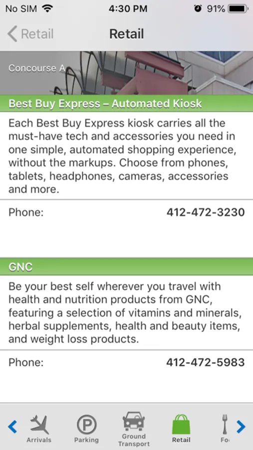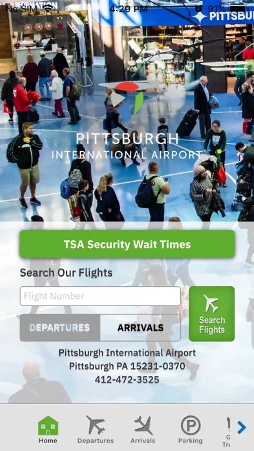Pittsburgh International Airport's Official App features real-time flight arrival and departure information, including security wait times, and real-time parking capacities at the airport. It provides passengers with information about parking, airlines, ground transportation and the retail options at the Pittsburgh International Airport.