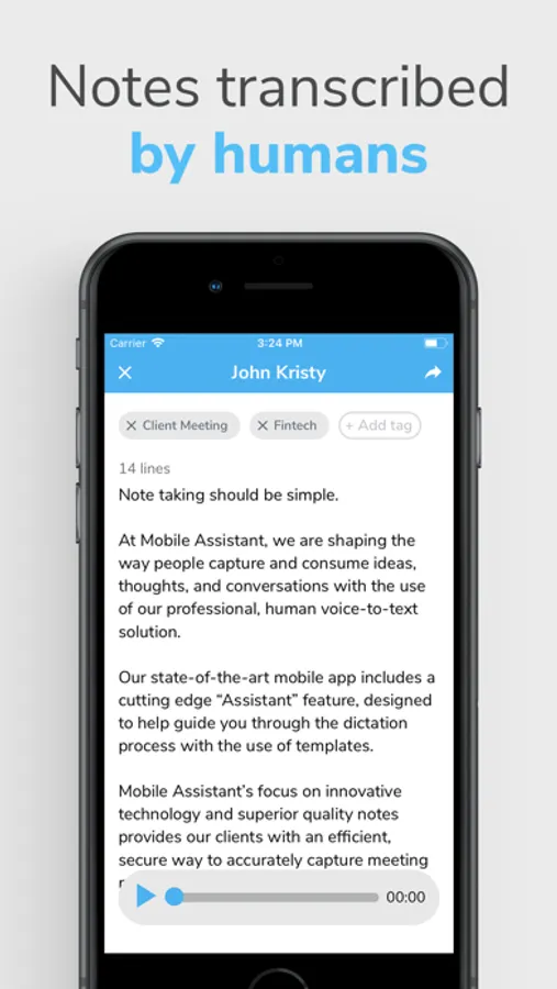 Mobile Assistant utilizes professional, U.S.-based, human transcriptionists, trained to accurately type your notes. This is NOT voice-recognition software.