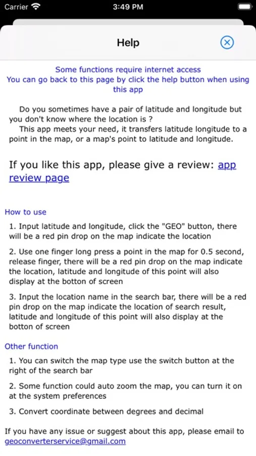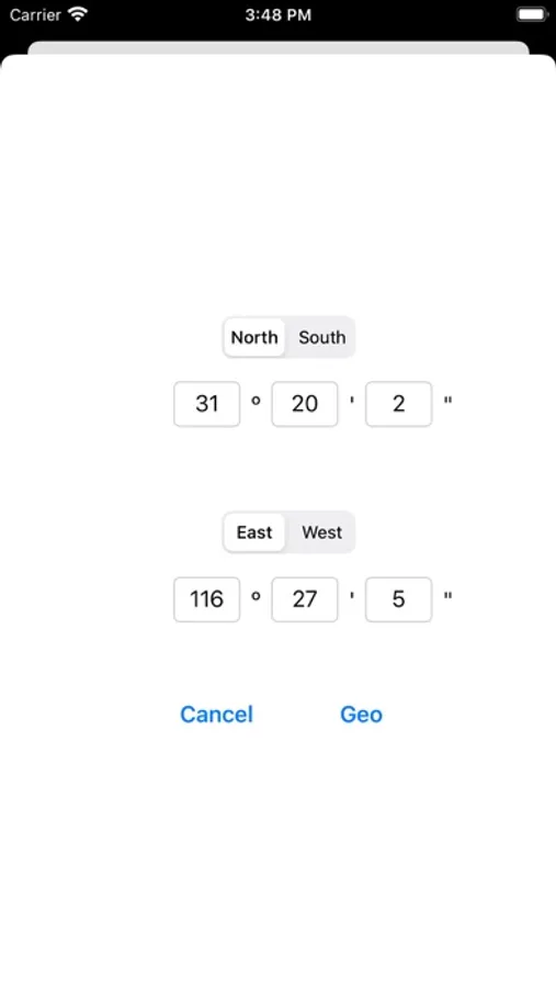 1. Input latitude and longitude, click the "GEO" button, there will be a red pin drop on the map indicate the location