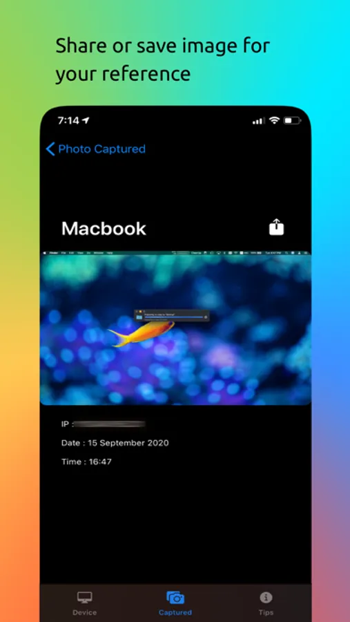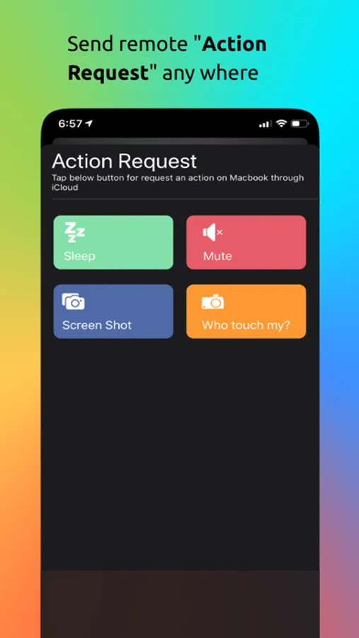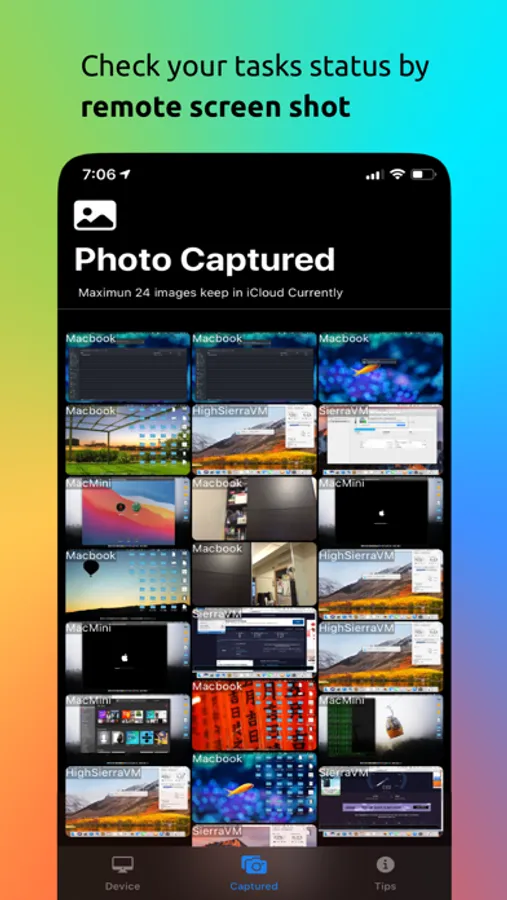 "Photo Captured" page it shows your Mac screen shot / FaceTime camera capture remotely those requested by "Action Request" features. This is a convenient way to check the status if you doing some tasks like long time video rendering or huge amount of files copying without the person who near by your Mac. You can leave your computer and go shopping ,dinner or supper..... and check the status any where any time on your phone immediately by simple step.
