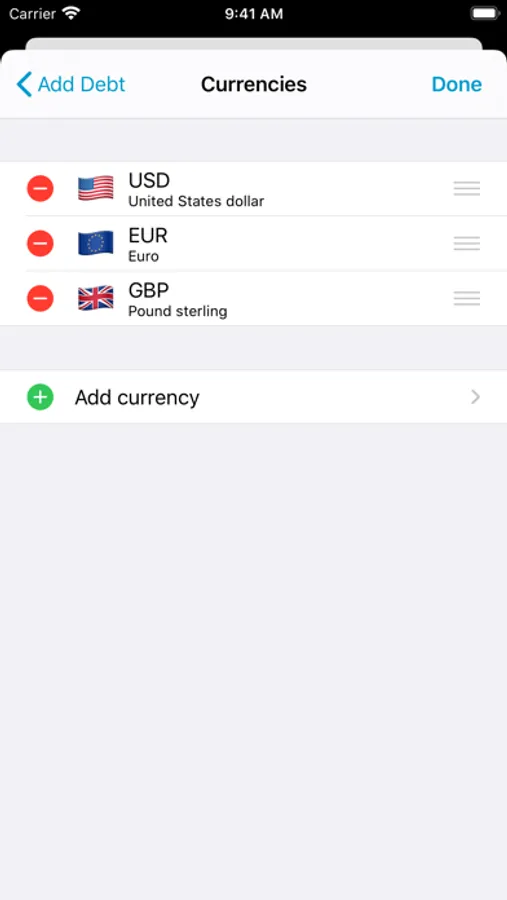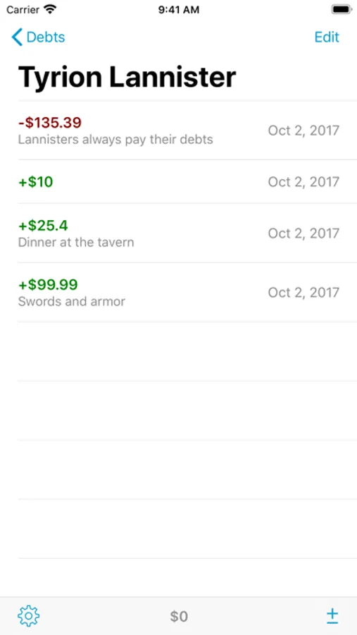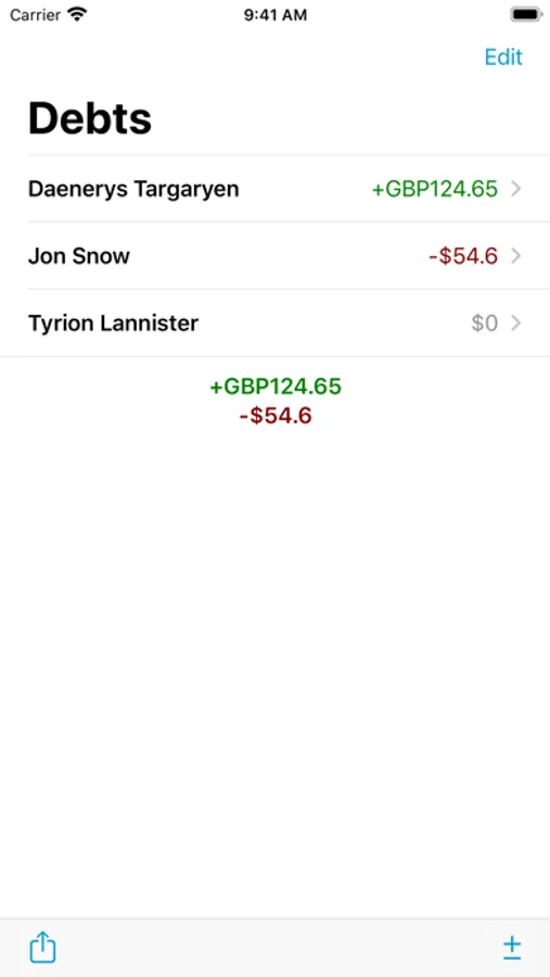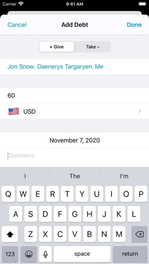Simply press "+" button when you pay for someone, lend your friend some money or borrow money yourself. Enter the name of the person, choose whether you give or take money, enter amount – and that's it! Change currency if necessary, choosing from one of your favorites or any other world currency. Change the date or enter a comment if you want, for your later convenience. Enter multiple names to split the amount between multiple persons. Add "Me" or "I" there to include yourself in the split!