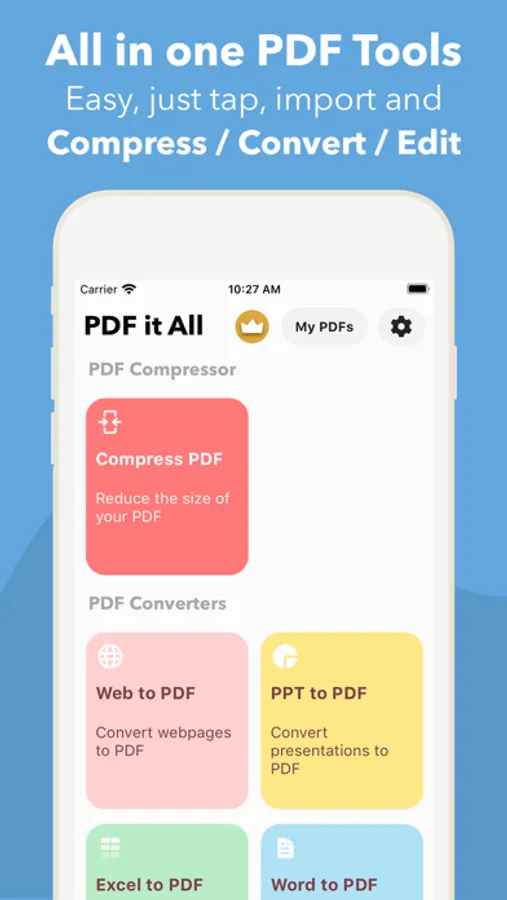 PDF it All is an advanced and yet very simple to use PDF tool that allows to edit/convert PDF files. Also, you can compress your big PDF files for easier file sharing!