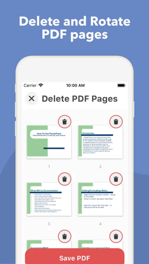Remove one or more pages of your PDF. Just import the PDF and select the pages you want to remove. It's very easy!