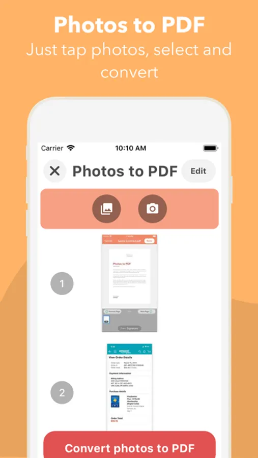 Digitilize your photos by selecting them from your camera roll or simply take a picture. Create a PDF from photos in a matter of seconds.